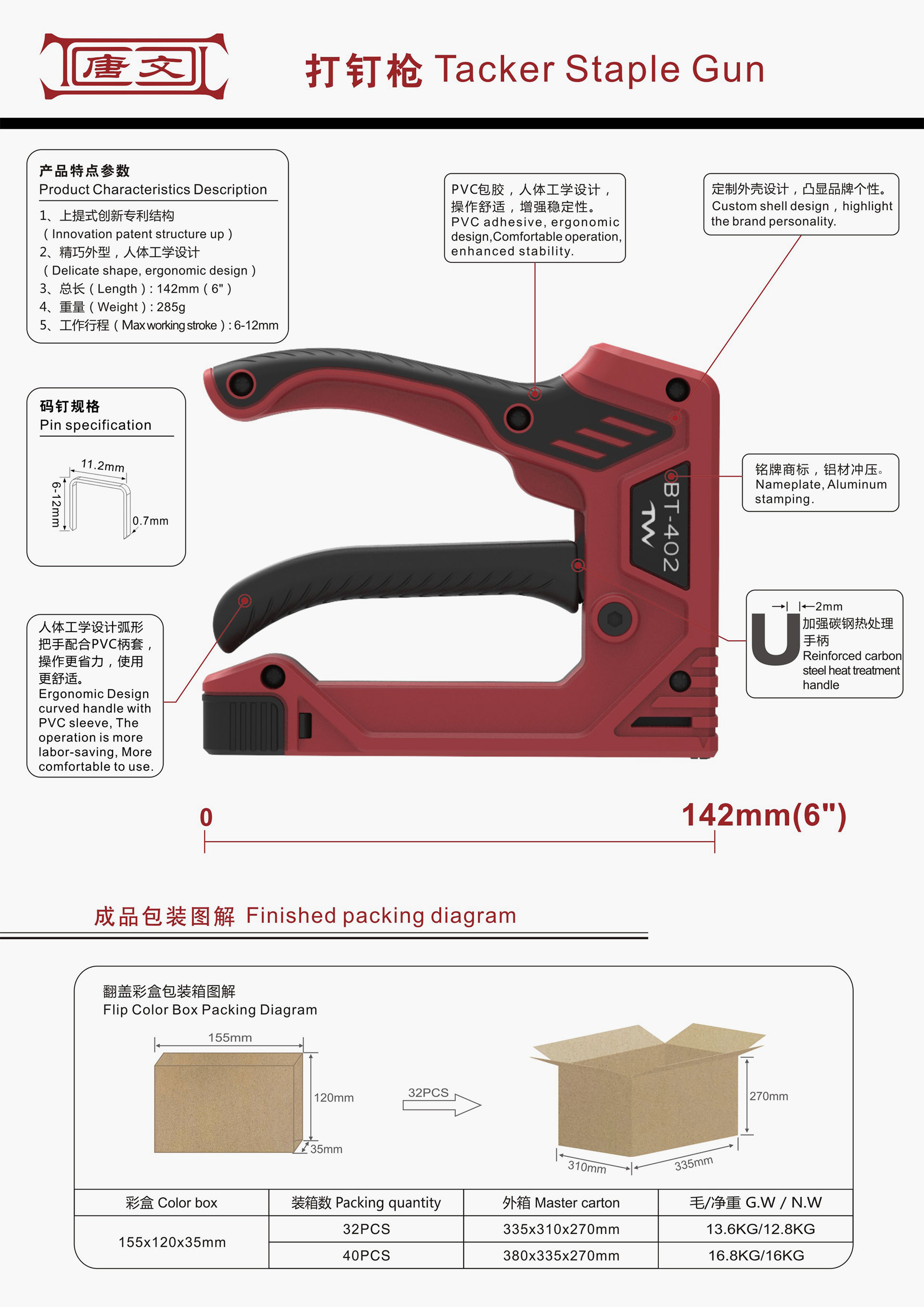 PVC包膠,人體工學設計,操作舒適,增強穩定性。定制外殼設計,凸顯品牌個性。人體工學設計弧形把手配合PVC柄套,操作更省力,使用更舒適。銘牌商標,鋁材沖壓。加強碳鋼熱處理手柄